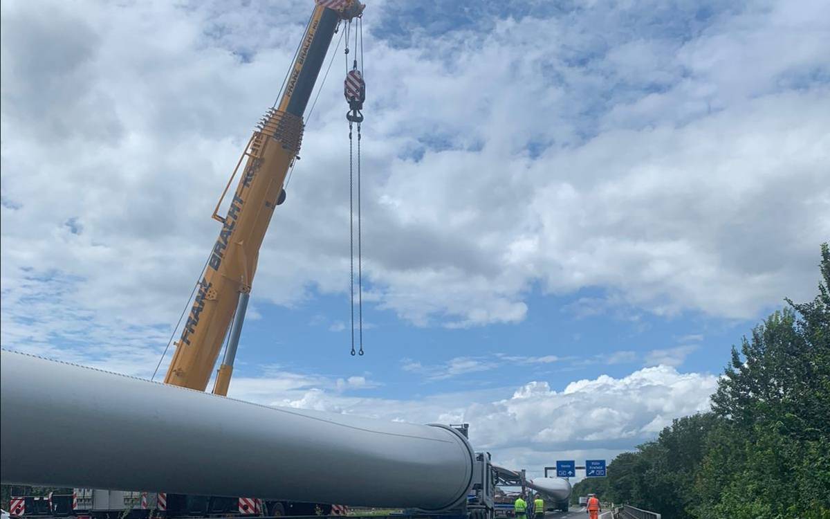 Der defekte, mit einem Windflügel beladene Schwertransporter konnte abgeschleppt, und der Windflügel umgeladen werden. Trotzdem werden Teilsperrungen und Einschränkungen bis in die Abendstunden erwartet.