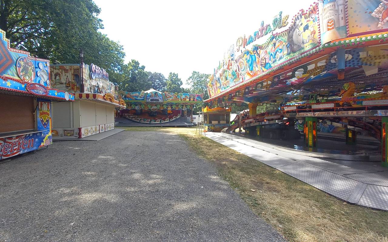 Die Straße "Lange Kamp" ist bereits seit Dienstag (27.6.) gesperrt. Dort sind bereits viele Buden aufgebaut. Ebenso in dem kleinen Park zwischen "Lange Kamp" und der A42. Dort stehen zum Beispiel bereits ein Kinder-Kettenkarussell, ein Autoscooter, das Fahrgeschäft "Big Monsters", bei dem Gondeln an künstlichen krakenarmen hängen. Die Achterbahn "Super Mouse" ist noch nicht aufgebaut - viele Teile liegen aber schon bereit.