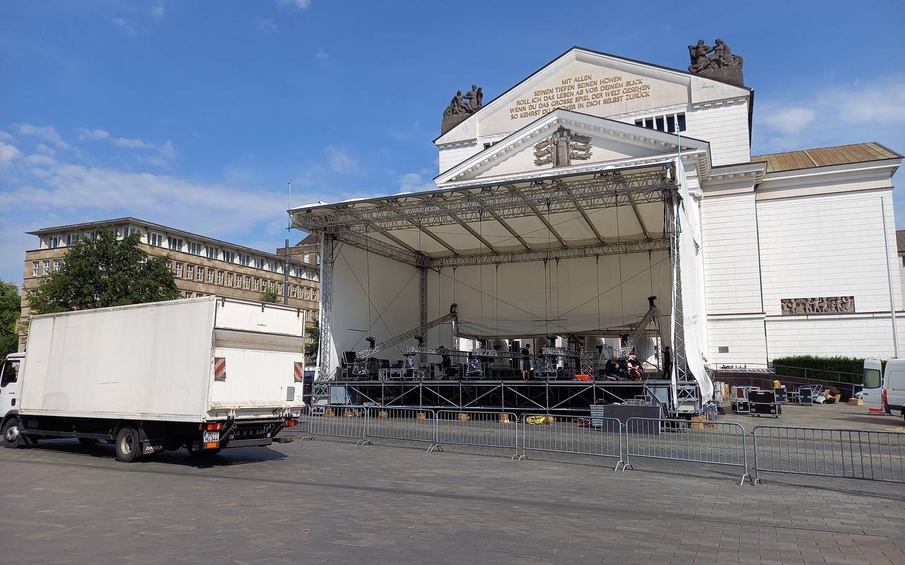 Die Bühne vor dem Opernplatz steht schon. Aktuell sind mehr als zehn Techniker damit beschäftigt, Licht und Ton startklar zu machen. Kleinere Laster laden auch immer noch neues material vor dem Stadttheater ab. Auch die Klappstühle für das Publikum stehen schon auf großen Rollwagen bereit und werden wohl auch demnächst aufgestellt.