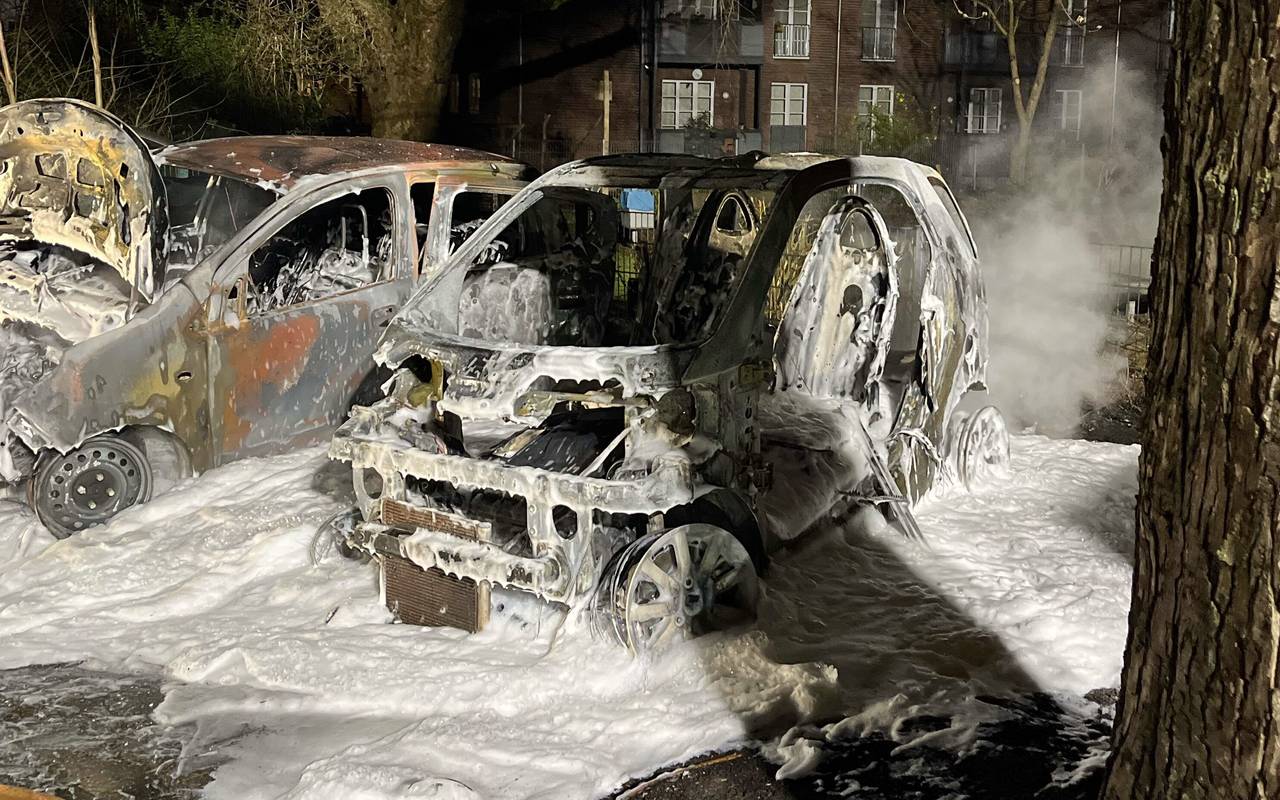In einem Garagenhof in Obermarxloh sind zwei Autos komplett ausgebrannt.