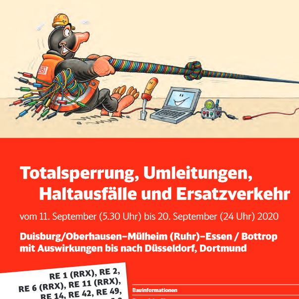 Die Bahn arbeitet vom 10.9. (5.30 Uhr) bis 20.9. (0.00 Uhr) am neuen elektronischen Stellwerk in Duisburg. In der Zeit fallen Züge aus oder fahren größere Umleitungen. Für das neue Stellwerk verlegen Arbeiter auf etwa 28 Kilometern insgesamt rund 9.900 Meter neue Kabel, 4.500 Meter Kabelkanäle, 26 Querungen und 29 neue Weichenantriebe. Die Kosten für die Bahn belaufen sich auf über 15 Millionen Euro.
