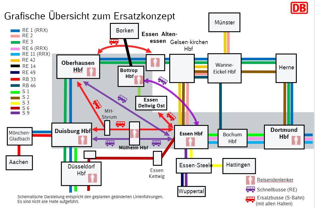 Schnellbusse sind als Ersatz für RE-Züge unterwegs und fahren die Hauptbahnhöfe in Duisburg, Mülheim an der Ruhr, Essen und Oberhausen an. Ersatzbusse fahren zum Beispiel wie die S1 und halten an den S-Bahn-Haltestellen. Die Busse sie etwas länger unterwegs als die regulären Züge. In den Bussen werden keine Fahrkarten verkauft.