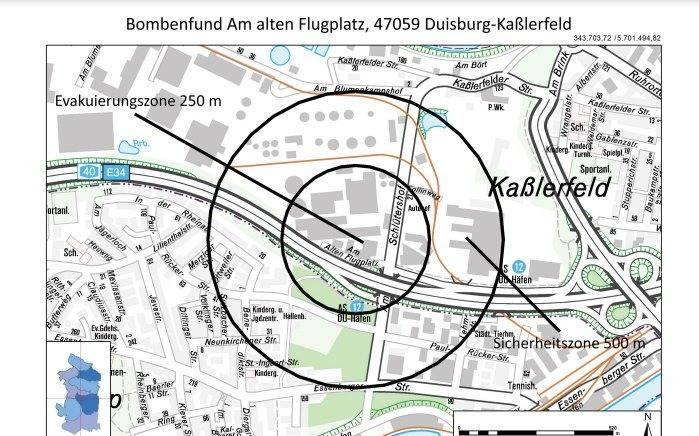 Bei Sondierungsarbeiten wurde heute (21.6.) eine Fünf-Zentner-Bombe auf der Straße "Am Alten Flugplatz" entdeckt. Die Entschärfung ist für 20 Uhr geplant. In der Evakuierungszone ist keine Person betroffen. In der Sicherheitszone leben etwa 500 Menschen. Dort darf sich ab ungefähr 19 Uhr niemand mehr im Freien aufhalten. Außerdem wird die A40 ab ca. 19:30 Uhr in beiden Richtungen zwischen Homberg und Häfen gesperrt. Ebenso greifen alle Sperren rund um die Zonen ab 19 Uhr. Informationen gibt es auch über Call Duisburg unter 0203/283-2000 und das Gefahrentelefon der Feuerwehr unter 0800/112 13 13. Auch die Warn-App NINA informiert über Gefahrenlagen.