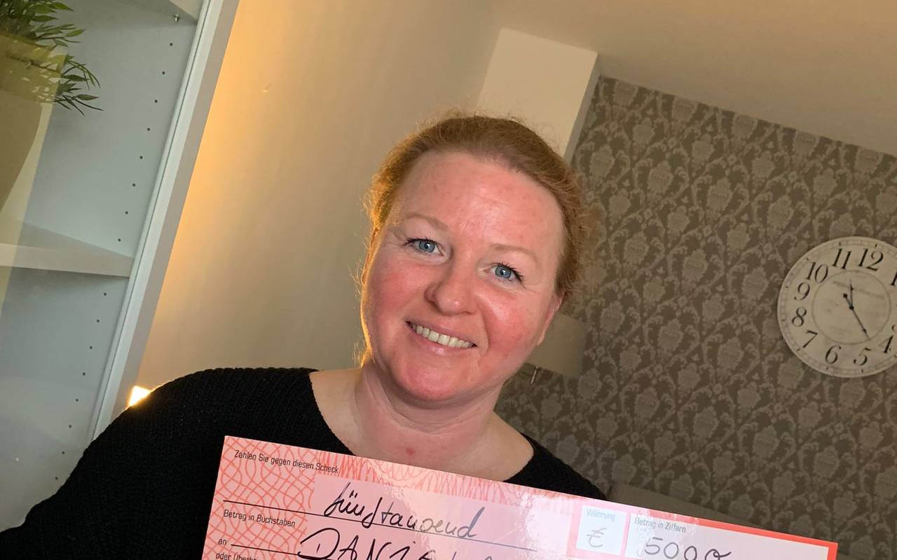 Wir sind direkt zu ihr gefahren und haben ihr den Scheck über 5000 Euro gebracht.Daniela ist selber Motorradfahrerin und kannte das Geräusch noch von einem alten Helm. Morgen hat sie Geburtstag und freut sich natürlich über das vorzeitige Geschenk.