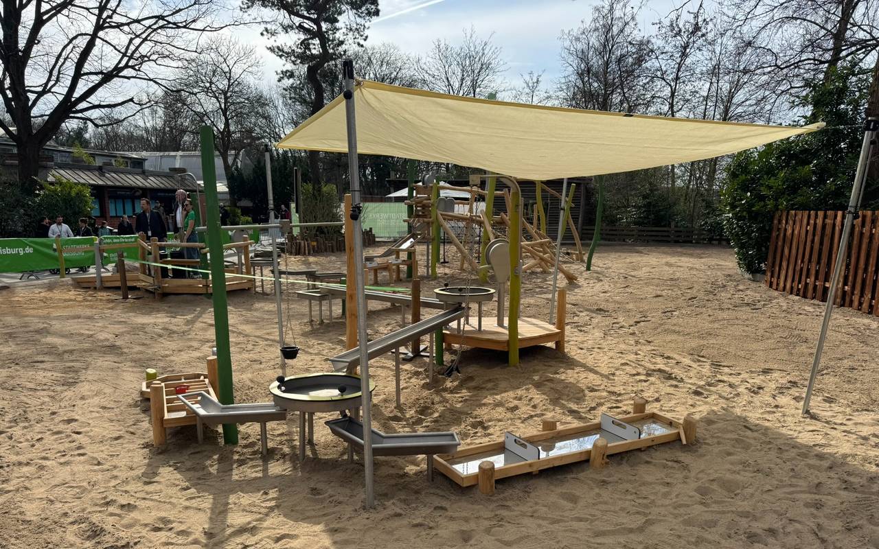 Auf 600 m² Fläche bietet der neue Wasserspielplatz im Zoo Duisburg alles, was das Kinderherz begehrt. Neben der klassischen "Spielplatzeinrichtung", wie einer Rutsche und Klettermöglichkeiten, hat der Wasserspielplatz eine Besonderheit: Über Pumpen und Brunnen können die Kinder das Wasser durch die Rinnen laufen lassen, Sandkuchen bauen und vieles mehr.