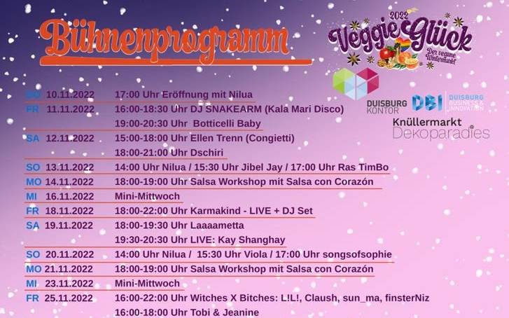 Er ist ein bisschen ab vom Schuss und um einiges ruhiger als sein großer Bruder: Der Veggie-Glück-Wintermarkt. Hier gibt es Glühwein für 2,50 € und viele verschiedene vegetarische und vegane Speisen. Daneben werden auch nachhaltig produzierte Waren angeboten und ein wechselndes Programm von Workshops bis hin zu kleinen Konzerten (siehe Foto).