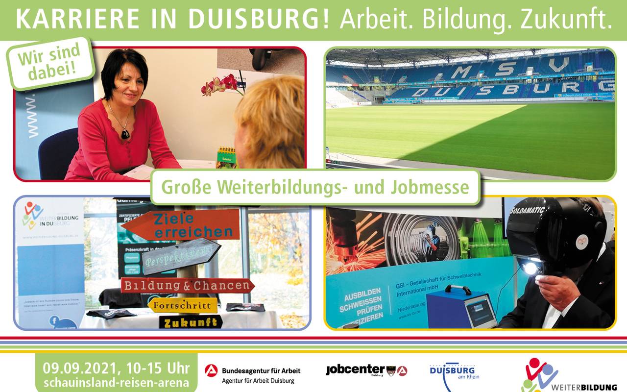 "Arbeit, Bildung, Zukunft" - das ist die Überschrift der diesjährigen Karrieremesse in der schauinslandreisen-arena. Am 9. September präsentieren sich dort Unternehmen. Ihr bekommt Infos über aktuelle Jobangebote und alles rund um das Thema Weiterbildung. Außerdem bekommt ihr dort unter anderem kostenlose Bewerbungsfotos, es gibt einen Fahrschul- und Schweißsimulator und den Bewerbungsmappen-Check. Organisiert wird das Ganze von dem Netzwerk Weiterbildung Duisburg, der Agentur für Arbeit, dem jobcenter und der Stadt Duisburg. Der Eintritt ist frei. Die Messe läuft von 10 bis 15 Uhr.