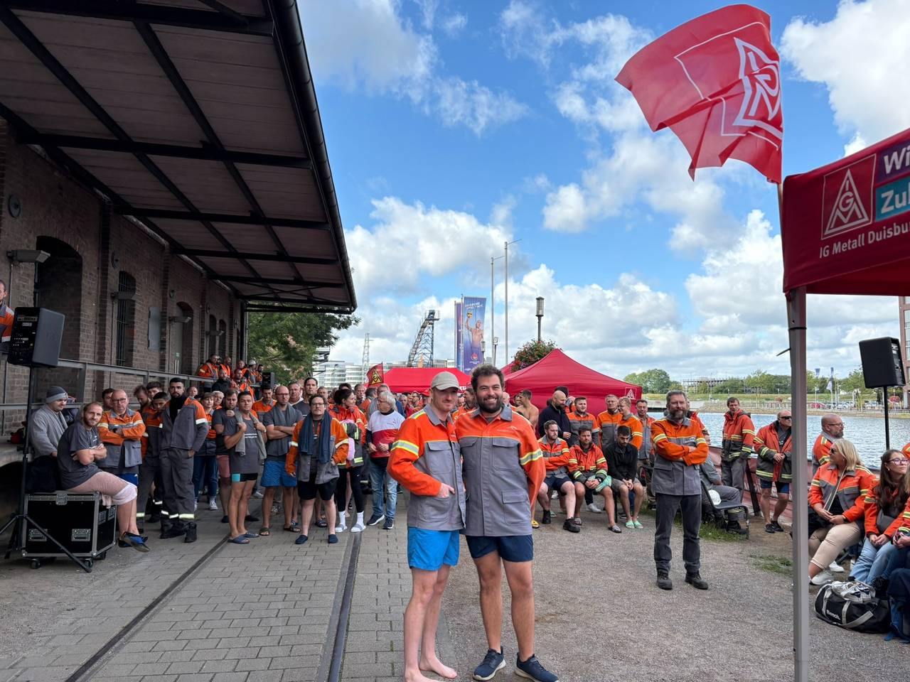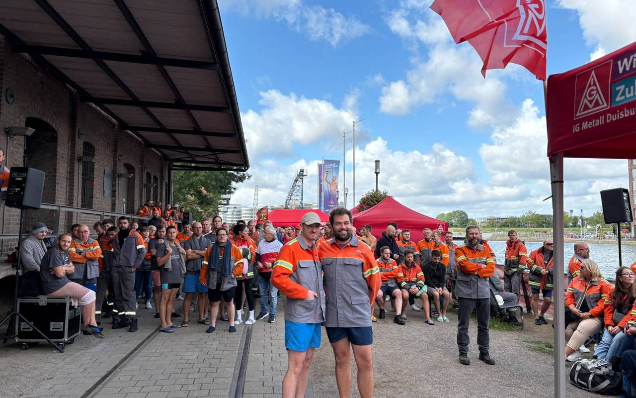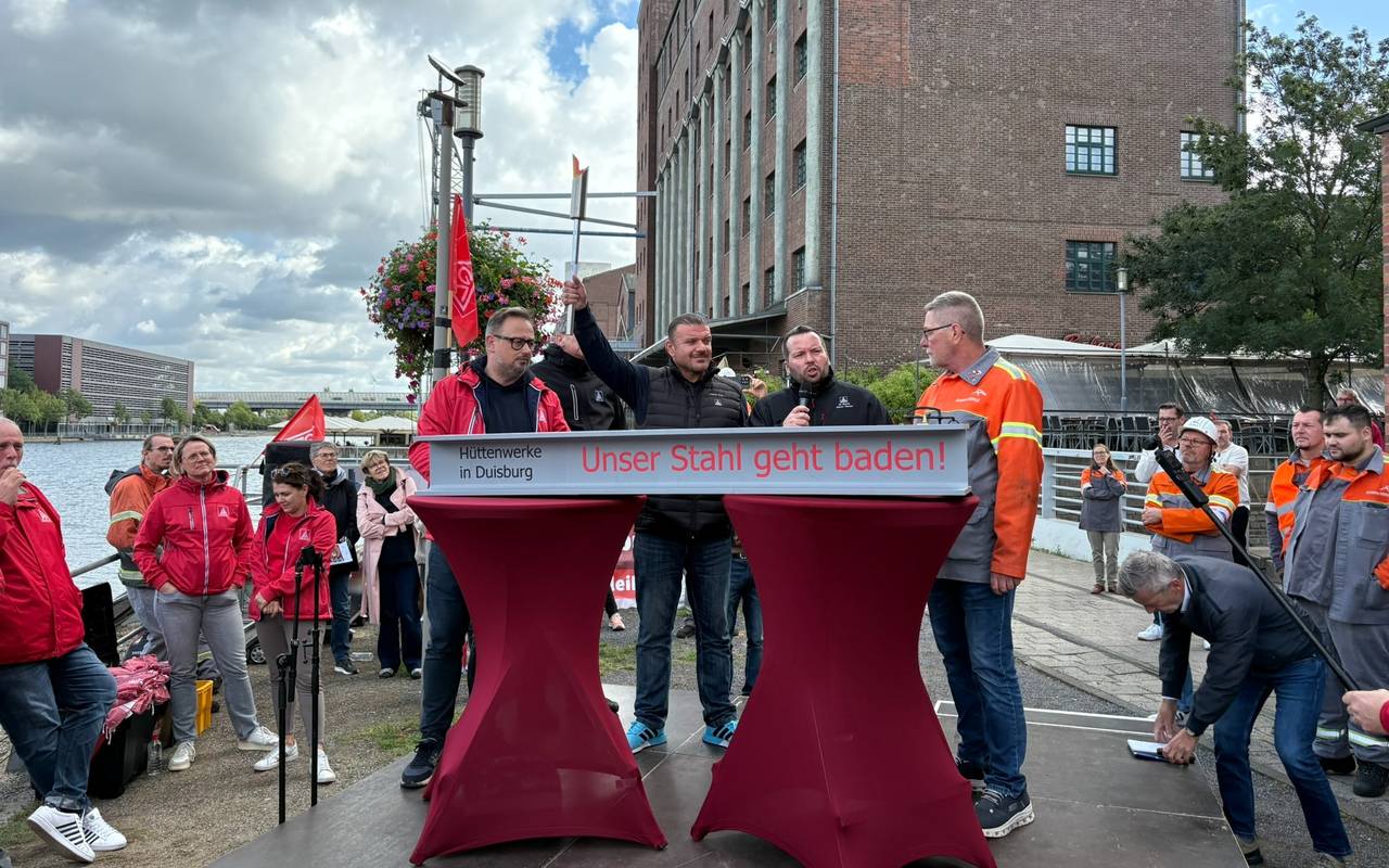 Die Belegschaft von ArcelorMittal Duisburg-Ruhrort ist heute (12.09.) für ihre Arbeitsplätze auf die Straße gegangen. Die IG Metall hatte zu einer Kundgebung am Duisburger Innenhafen aufgerufen, bei der Stahlarbeiter buchstäblich ins Hafenbecken gestiegen sind. Hunderte Stahlarbeiter waren vor Ort, um zu demonstrieren.