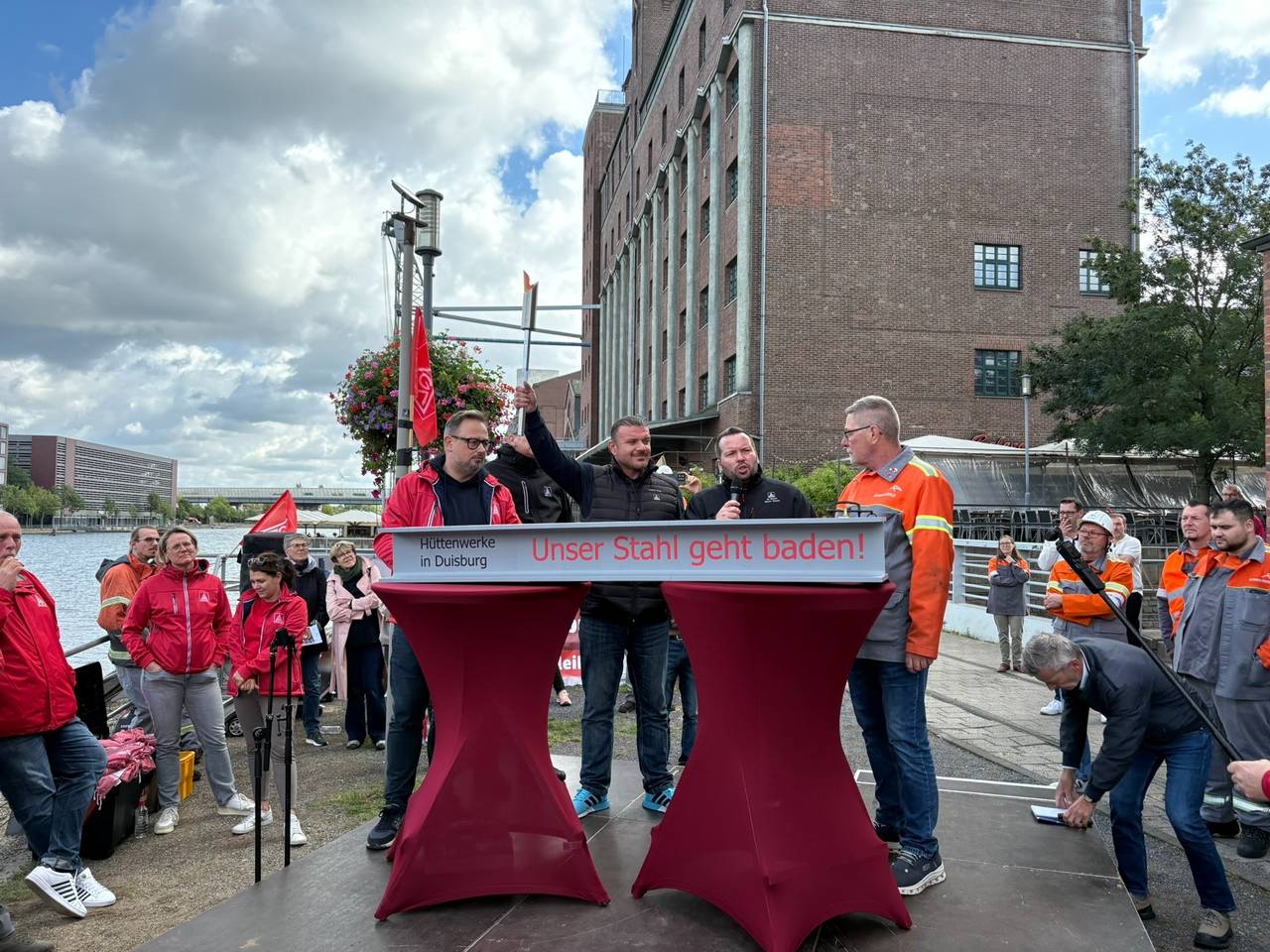 Dominik Schütte, stellvertretender Vertrauenskörperleiter der IG Metall, betont: "Die Belegschaft kämpft geschlossen für ihre Arbeitsplätze und damit auch für den Stahlstandort Duisburg." Es gehe um den gesamten Stahlstandort Deutschland. Unter dem Hashtag #wirmüssenflüssigbleiben mobilisierte die IG Metall in den sozialen Medien für die Kundgebung. Der Slogan spielt auf die Flüssigphase der Stahlproduktion an, die in Deutschland erhalten bleiben soll. IG Metall-Geschäftsführer Karsten Kaus warnt vor den Folgen weiterer Untätigkeit: "Arbeit geht verloren, und damit Wertschöpfung und Wohlstand. Die Menschen hätten weniger Geld in der Tasche."