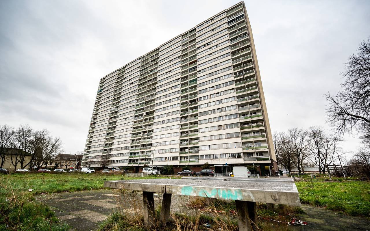 Meldekontrolle im Weißen Riesen in Hochheide. Die Stadt hat dort seit dem frühen Morgen die Bewohner überprüft.