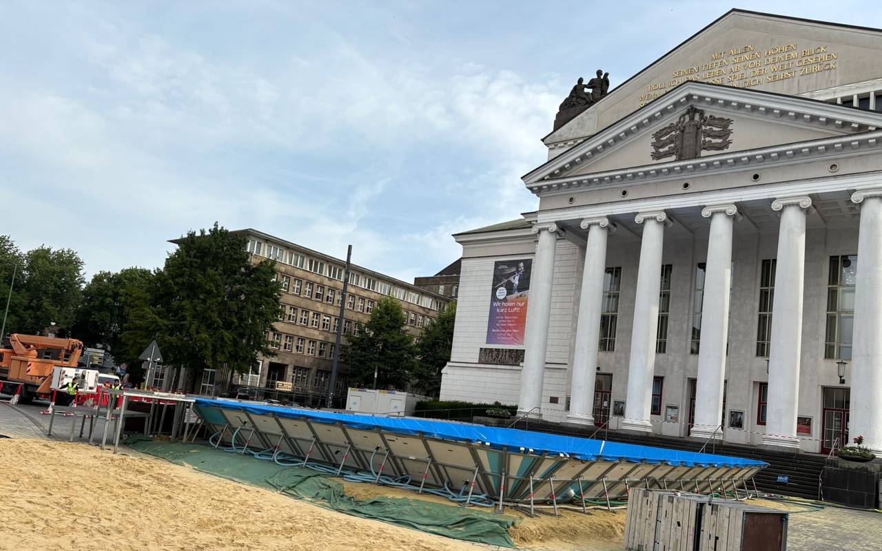 Der FISU Sportcampus vor dem Duisburger Stadttheater nimmt konkrete Formen an. Gestern wurde das mobile Schwimmbecken auf dem Opernplatz aufgebaut, heute fließt das Wasser hinein.