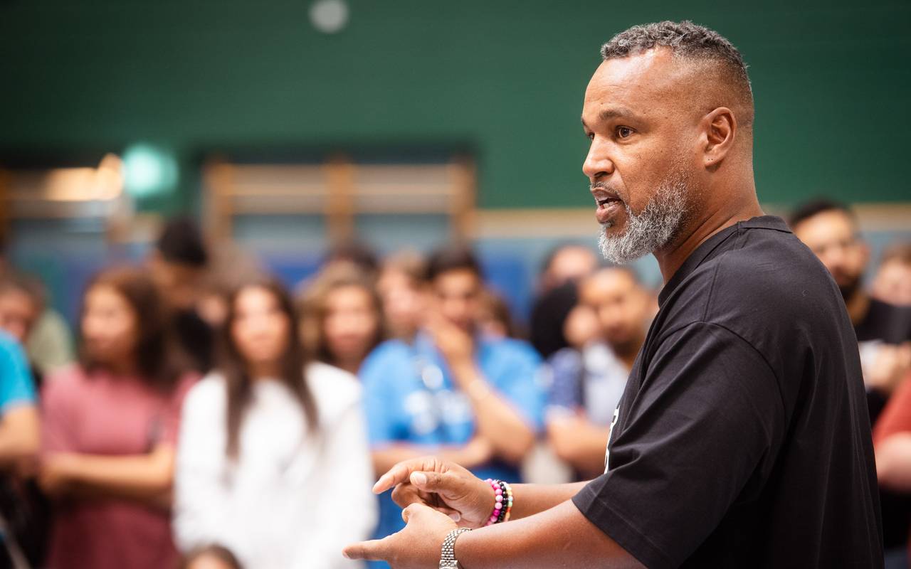 Patrick Esume wurde als Kommentator der NFL-Spiele sozusagen das (oder eines der) Gesichter des American Football in Deutschland. Der ehemalige Spieler und Trainer ist heute der Commissioner (Geschäftsführer) der European of Football. In der Turnhalle der Gottfried-Wilhelm-Leibniz-Gesamtschule in Hamborn hat er mit ca. 100 Schülerinnen und Schülern über sein Leben und seinen Weg zum Football gesprochen. 100 Tickets für das ELF-Finalspiel am 24. September in Duisburg hat er der Schule übergeben und spontan entschieden "wer kommt, darf auch mit auf's Feld!" NIcht nur das hat Eindruck bei den Schülerinnen und Schülern hinterlassen.
