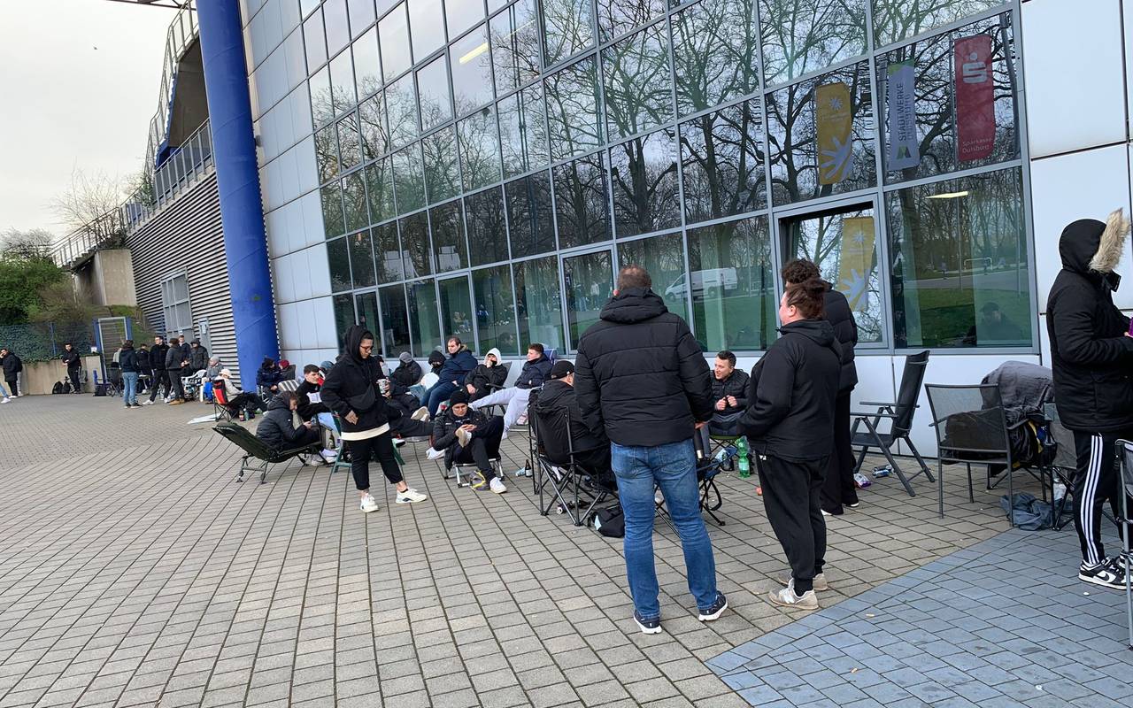 Nach Angaben des MSV Duisburg waren die Karten bereits nach wenigen Minuten weg. Insgesamt verfolgen 2.500 Duisburger das Spiel in Essen. Vor dem Zebra Shop an der Schauinsland Reisen Arena haben viele Fans auf Tickets gewartet. Manche haben sogar deshalb die Nacht vor dem Stadion verbracht.