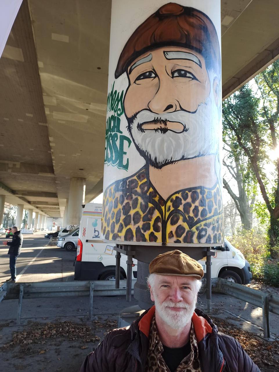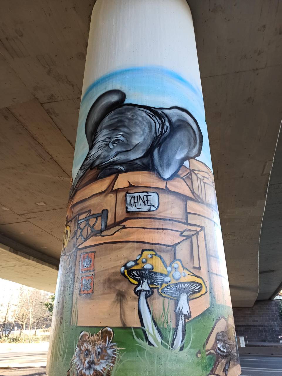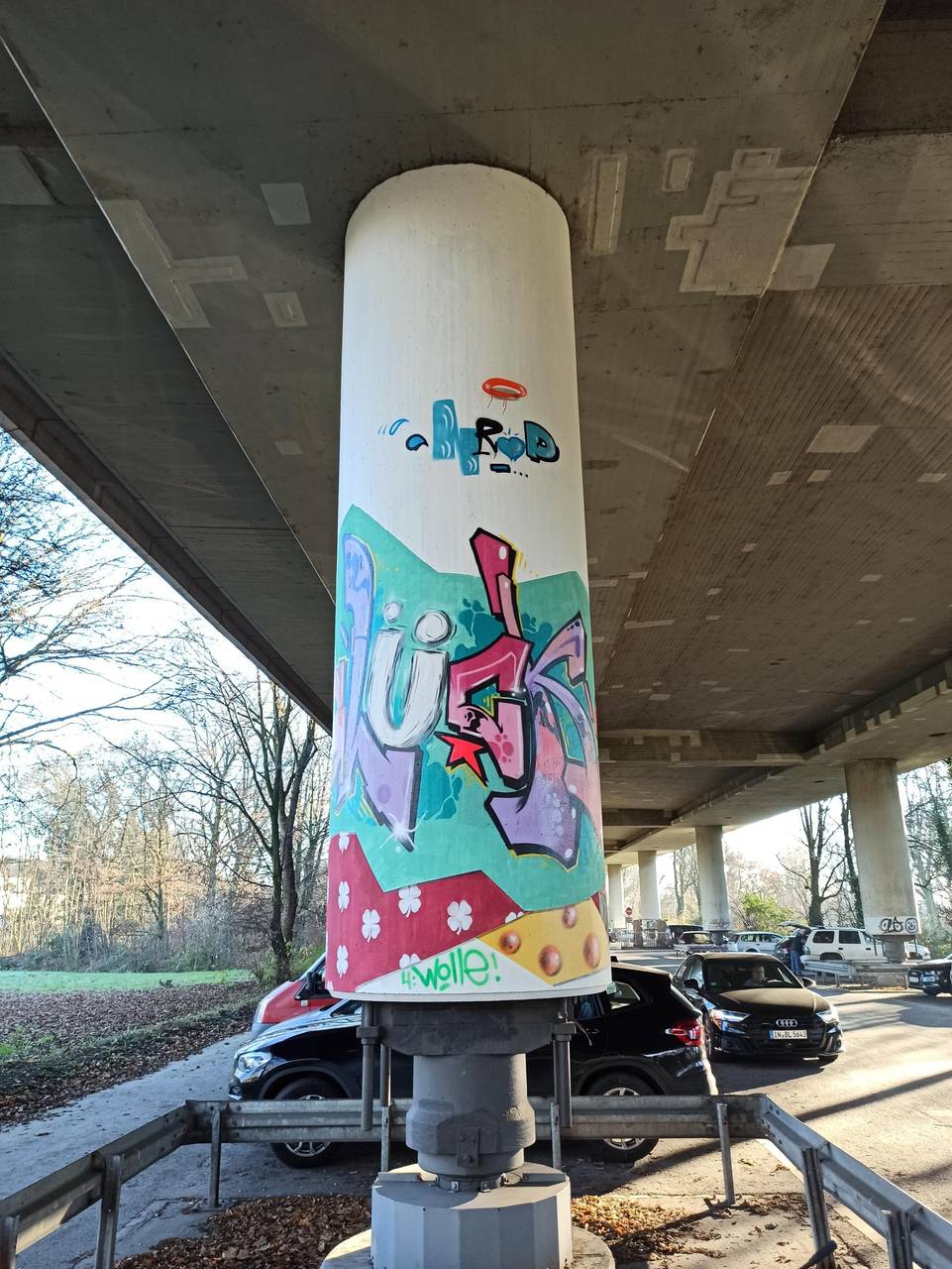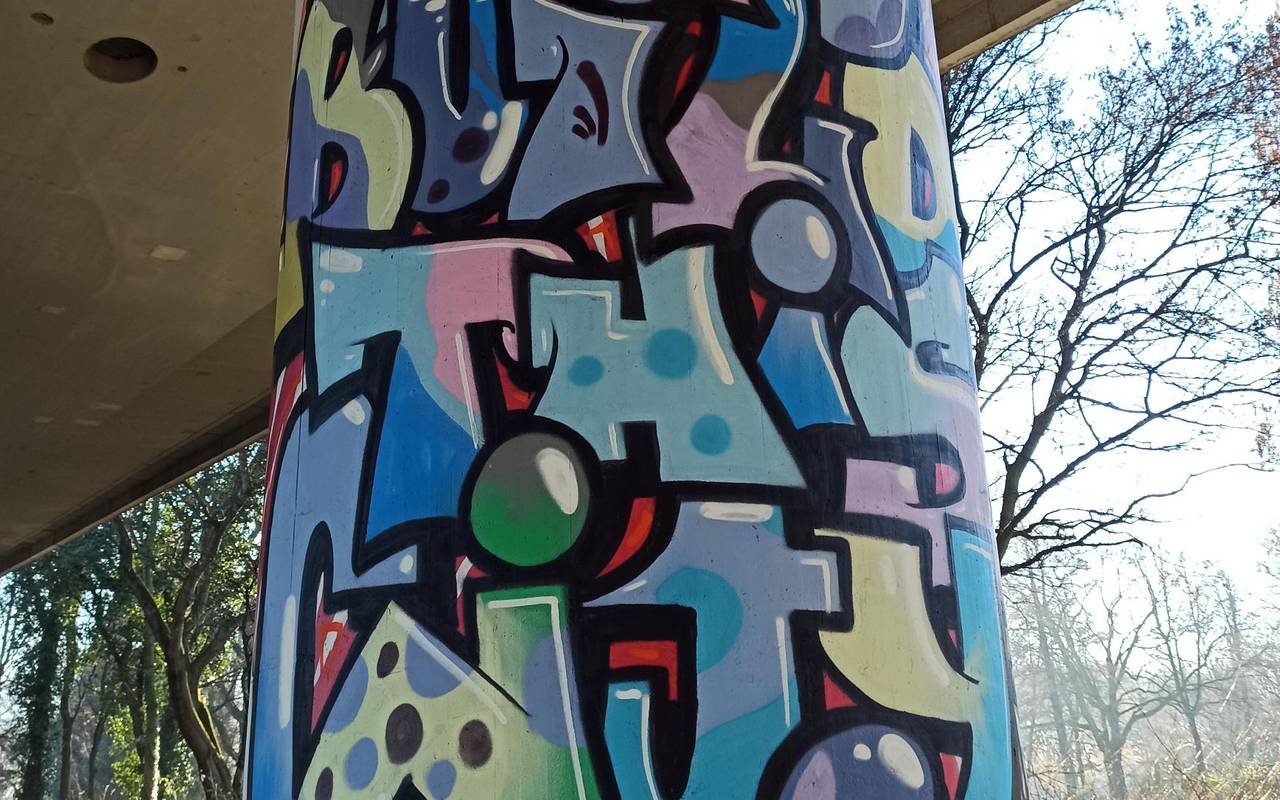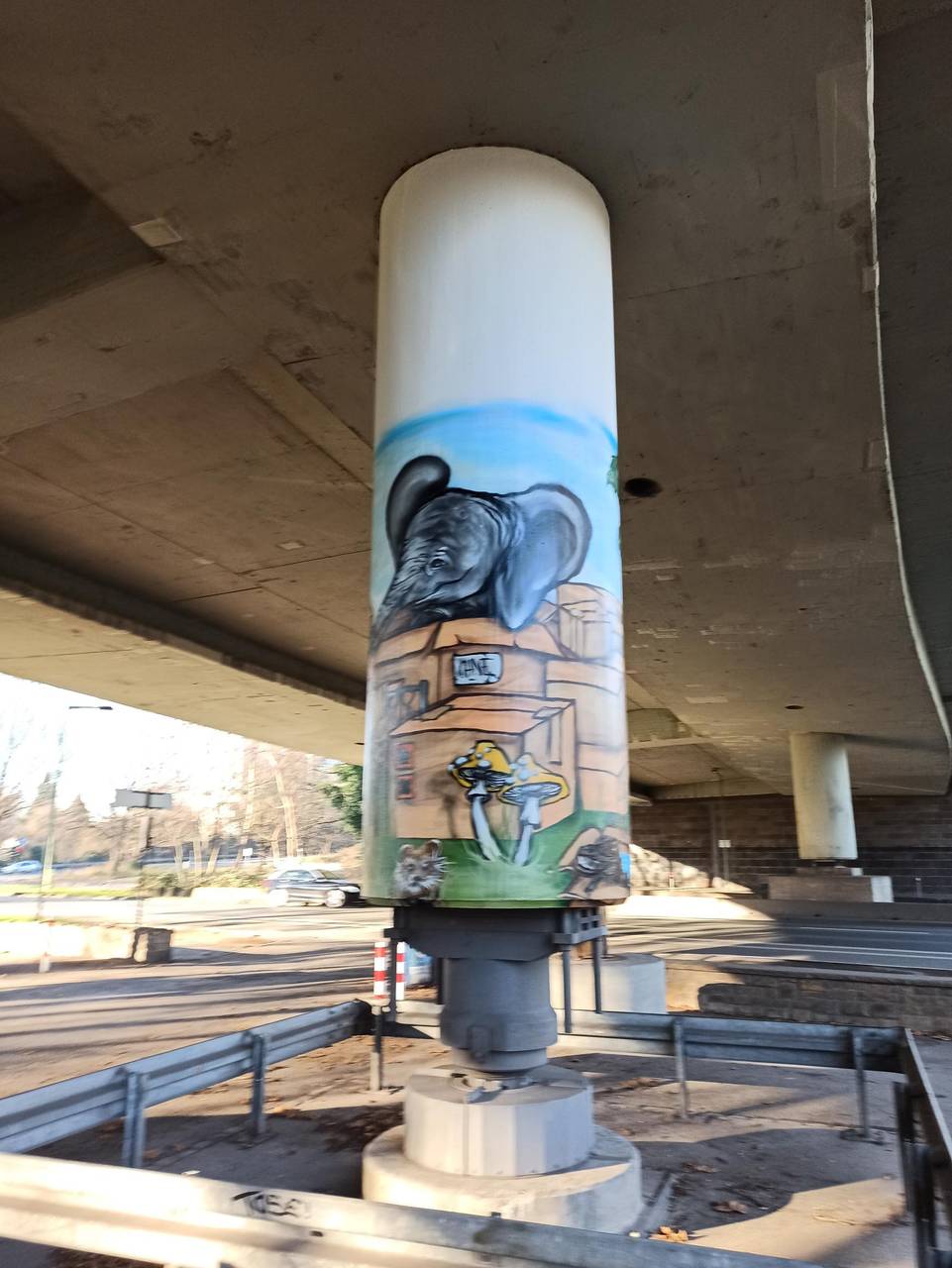 Auf dem dem Parkplatz Meidericher Stadtpark unter der A59 ist es bunt geworden. Auf vier Betonpfeilern der Brücke sind vier Graffitis entstanden - aufgesprüht von Profis - zum Thema "Heimat."
