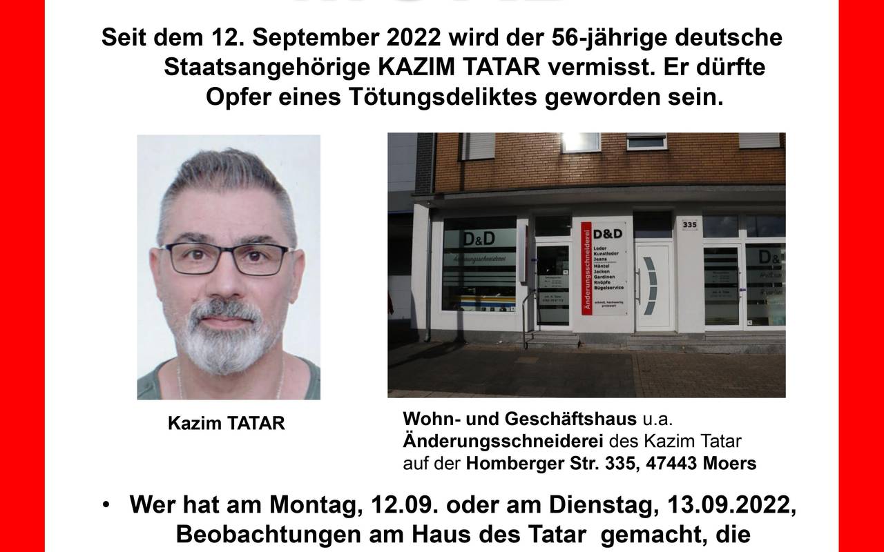 Die Kripo geht davon aus, dass er getötet wurde. Etwa drei Wochen nach dem Verschwinden von Tatar hat seine Wohnung an der Homberger Straße in Moers gebrannt. Wer Hinweise liefert, kann eine Belohnung von 3.000 Euro bekommen.