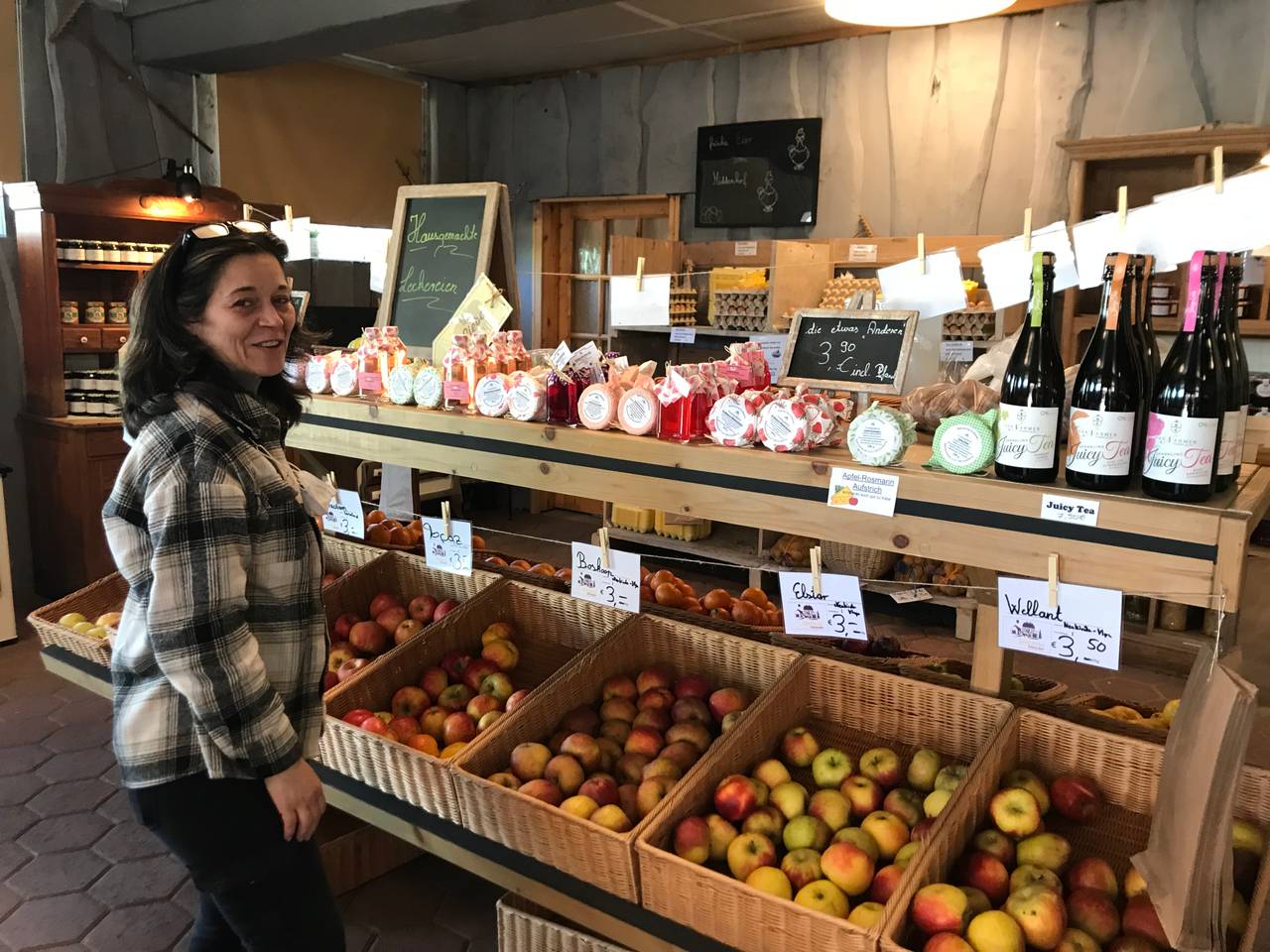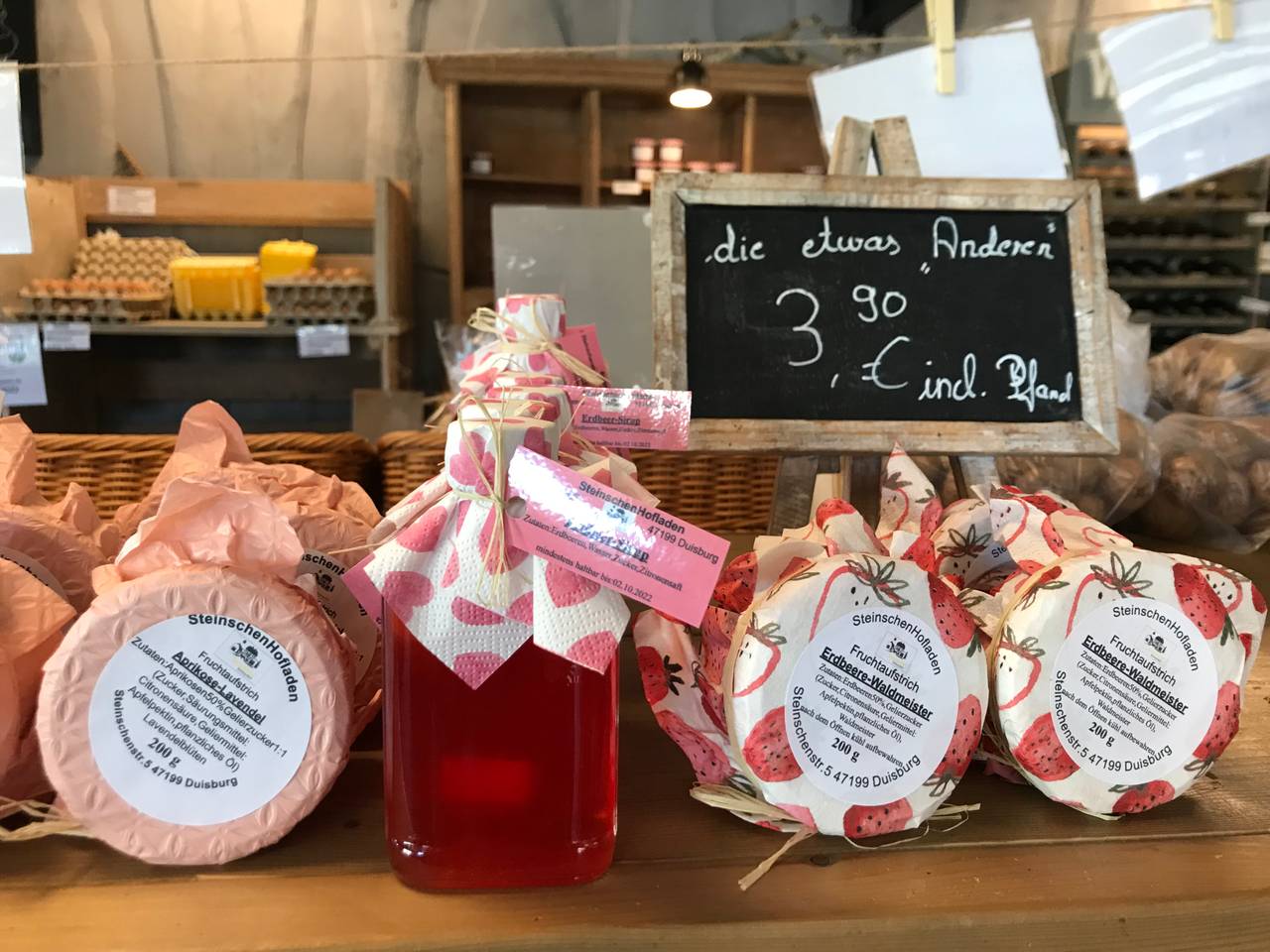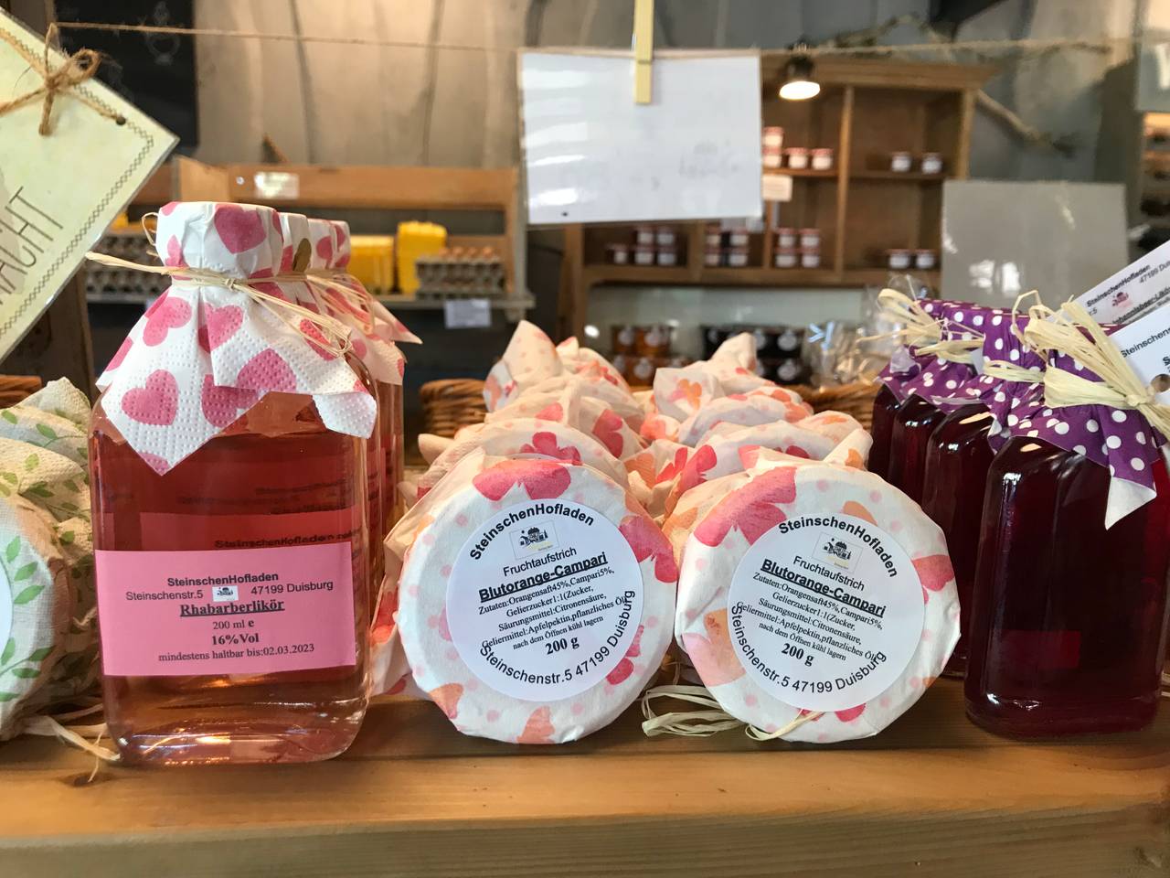 Wurst, Kartoffeln, Wein, Liköre, Honig, frisches Obst und Gemüse und noch vieles mehr bietet der urig-renovierte Laden auf dem Bauernhof in Baerl. Den Steinschen Hofladen gibt es bereits seit über 30 Jahren. Im Oktober 2021 hat Pilita Beltran die Geschäftsführung übernommen. Vorher hatte sie schon fast 20 Jahre dort gearbeitet. Auf dem Bauernhof gibt es immer frische Eier (abseits der Öffnungszeiten auch aus einem Automaten). Wenn Saison ist, auch Obst und Gemüse von den eigenen Feldern, zum Beispiel Kartoffeln, Erdbeeren oder Kürbis. Alle anderen. zugekauften Produkte kommen von Landwirten aus der Region. Marmeladen und Liköre - auch in außergewöhnlichen Kombinationen - stellt Pilita Beltran selbst her. Auch ihre individuell gestalteten Präsentkörbe seien eine Besonderheit.