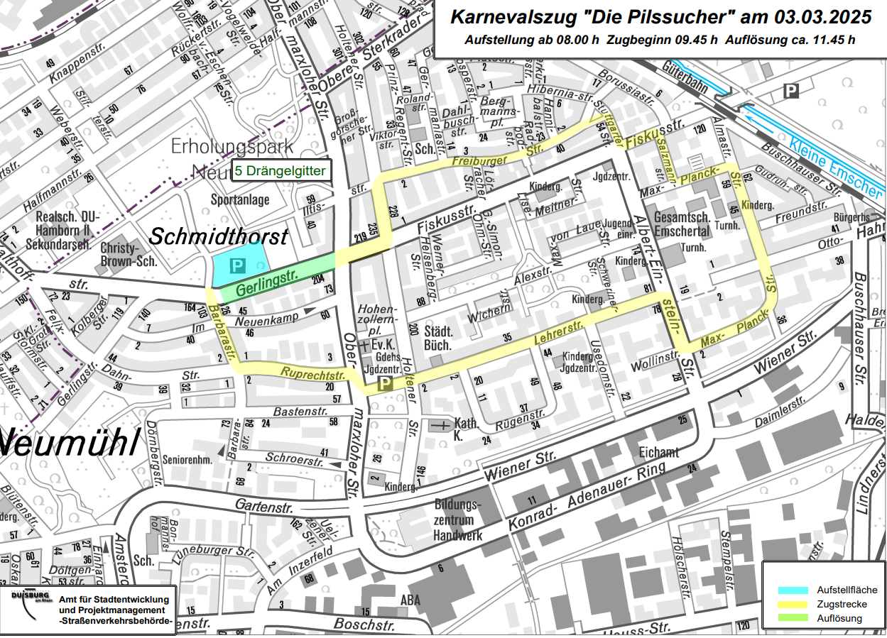 Es gibt eine Streckenänderung beim Duisburger Rosenmontagszug. Der Grund dafür ist eine Baustelle, die nicht rechtzeitig vorher fertig wird. Der Zug wird deshalb nicht von der Blumenstrasse rechts auf die Neudorfer Straße. Stattdessen geht es von der Blumenstrasse links auf die Neudorfer Straße und von dort aus dann rechts über die Alte Schanze auf die Koloniestraße.