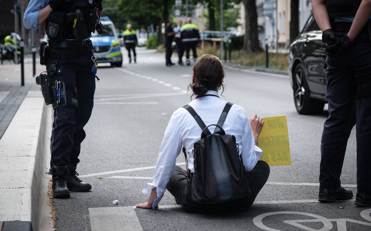 Klimaaktivisten haben am Freitag eine Aktion in Duisburg gestartet. Eine junge Aktivistin hat sich in Duissern auf die Kardinal-Galen-Straße geklebt.