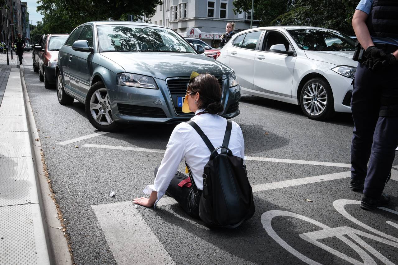 Klimaprotest: Aktivistin klebt sich in Duissern auf die Straße