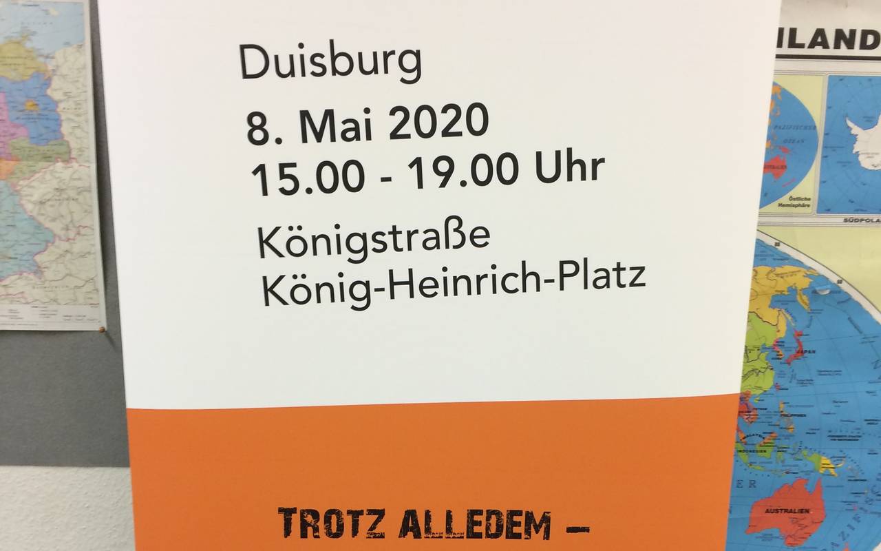 Das Bündnis „DU und WIR“ veranstaltet deshalb zwischen 15 und 19 Uhr einen Aktionstag. Rund um den König-Heinrich-Platz und auf der Königstraße wird es insgesamt 5 Bühnen und viele Aktionsflächen geben. Ca. 40 Organisationen haben bereits zugesagt und werden sich an der Kulturdemo beteiligen. Darunter VHS, Filmforum, DGB aber auch Sängerin Anja Lerch. Wir Duisburger sind eingeladen, uns am Programm zu beteiligen. Hauptsache es zeigt: Duisburg ist bunt und weltoffen. Das Motto bzw. der Titel ist: „Trotz alledem – wir feiern den 75. Jahrestag der Befreiung von der Diktatur des Hitler-Faschismus und des Kriegsendes“. Die Veranstalter hoffen auf ca. 5000 Teilnehmer. Hier geht es zur Facebook-Gruppe.