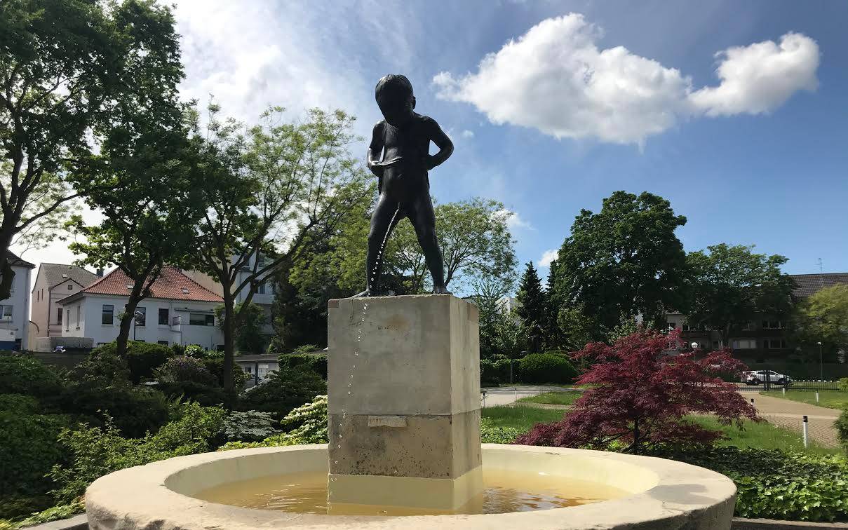 Das Duisburger Männeken Piss steht und pinkelt ab jetzt wieder in Ruhrort.