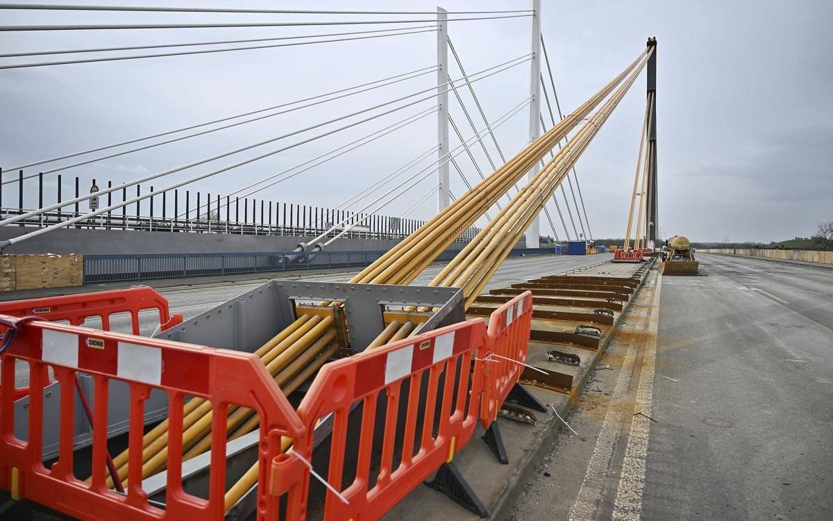 Es ist das erste Mal, dass eine Schrägseilbrücke dieser Größe in Deutschland zurück gebaut wird. 8400 Tonnen Stahl werden recycelt. Allein die Schrägseile wiegen 800 tonnen. Die Asphaltdecke wurde bereits teilweise abgefräst. Heute Mittag wird die Brücke dann mit einer speziellen Schweißmethode in der Mitte getrennt. Danach wird die Brücke Stück für Stück von jeder Seite abgebaut. Bei DEGES ist man zuversichtlich dass die alte Brücke im Herbst verschwunden ist und die 2. Brücke 2026 fertig wird.