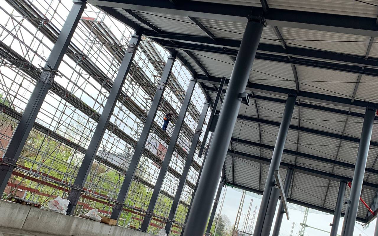 Der Neubau des Daches am Duisburger Hauptbahnhof liegt im Plan. An Gleis 12 und 13 ist die wellenförmige Konstruktion mittlerweile gut zu erkennen.