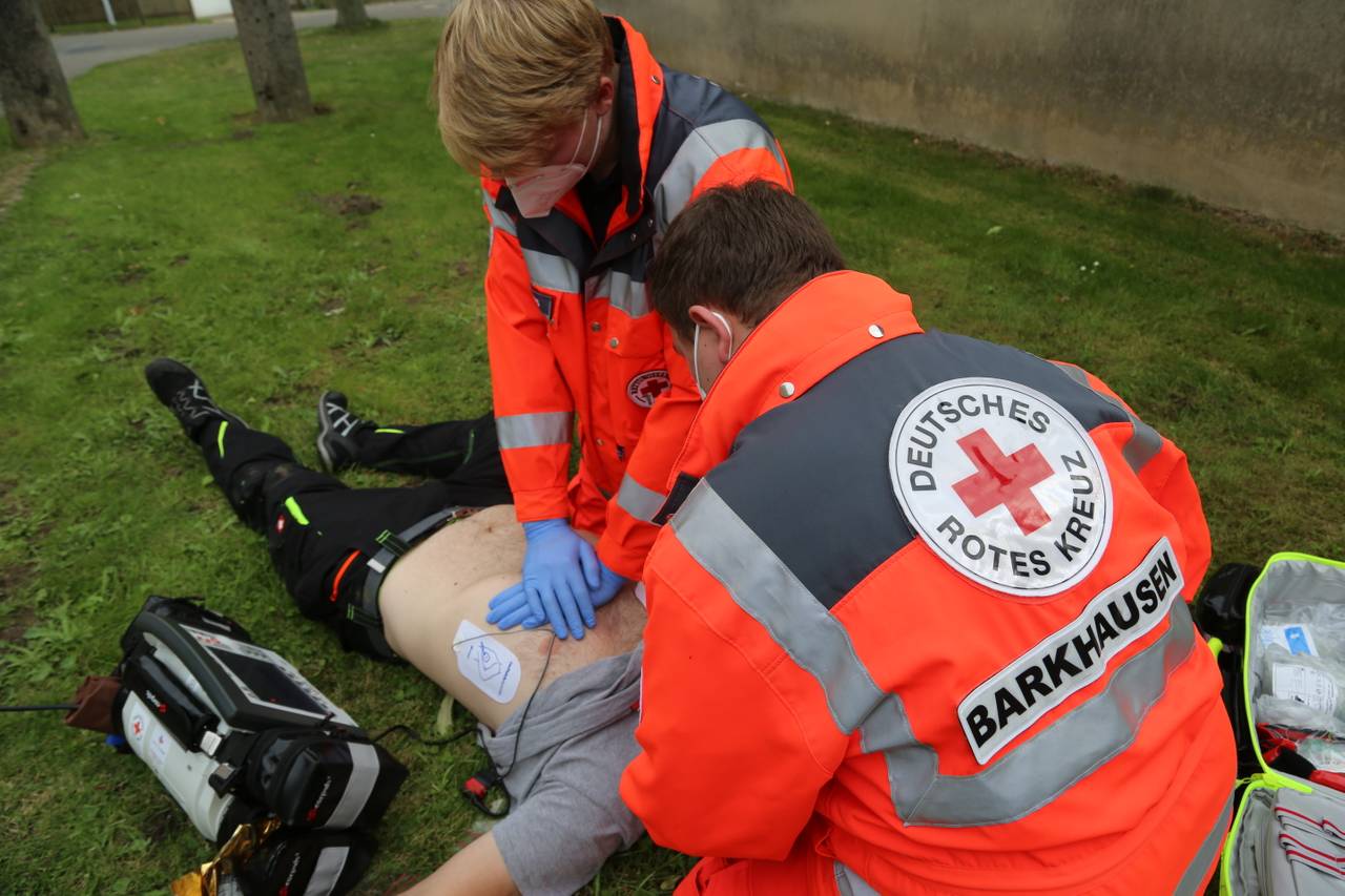 Beobachtet jemand einen Menschen, der in sich zusammensackt, soll er „prüfen“, ob der Betroffene auf Ansprache reagiert. Ist dies nicht der Fall, erfolgt der Notruf über die Nummer 112. Danach sollte sich der Ersthelfer seitlich neben den Patienten knien, die Hände verschränkt auf dem Brustkorb aufsetzen und das Brustbein 100-mal pro Minute fünf bis sechs Zentimeter zum Boden drücken. Auf diese Weise wird ein künstlicher Kreislauf erzeugt, der unter den gegebenen Umständen ausreicht, dass ausreichend Blut und Sauerstoff ins Gehirn fließen.