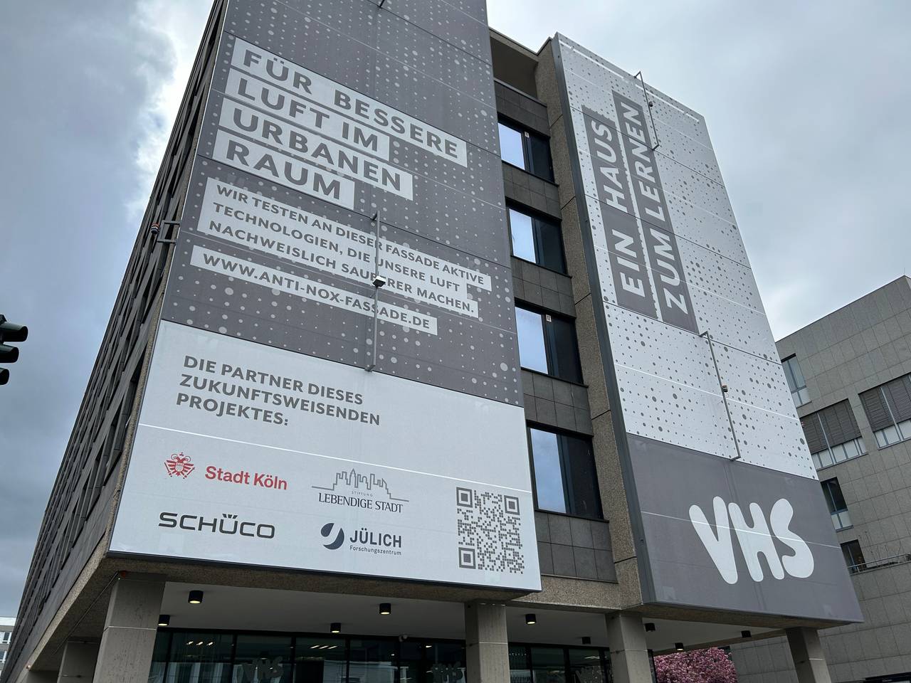 Am Gebäude der Volkshochschule Köln wurde eine "stickoxidbindende Textilfassade" installiert. Die Stadt Köln startet mit der Stiftung "Lebendige Stadt" und der Firma "Schüco" hier ein Pilotprojekt. Diese Fassade soll mittels aufgebrachter Wirkstoffe gesundheits- und umweltschädliche Stickstoffe filtern und diese in unschädliche Nitrate umwandeln. Die Verantwortliche erhoffen sich viel.