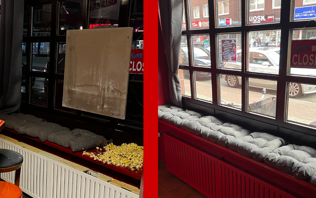 Die zerbrochene Scheibe mit einer Sperrholzplatte verdeckt. Weggeätzte Kissen auf der Fensterbank. Weiße Flecken auf Theke und Spüle. So hat es Anfang Januar nach einem Säureangriff im "Rheinhausener" Treff ausgesehen. Dank viel Solidarität im Stadtteil - und darüber hinaus - konnte die Kneipe noch im gleichen Monat wiedereröffnet werden.