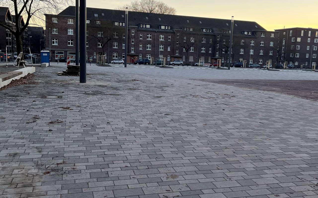 Vieles ist schon fertig beim Umbau des Hochfelder Marktplatzes. Allerdings dauert es noch bis der Wochenmarkt dort stattfinden wird.