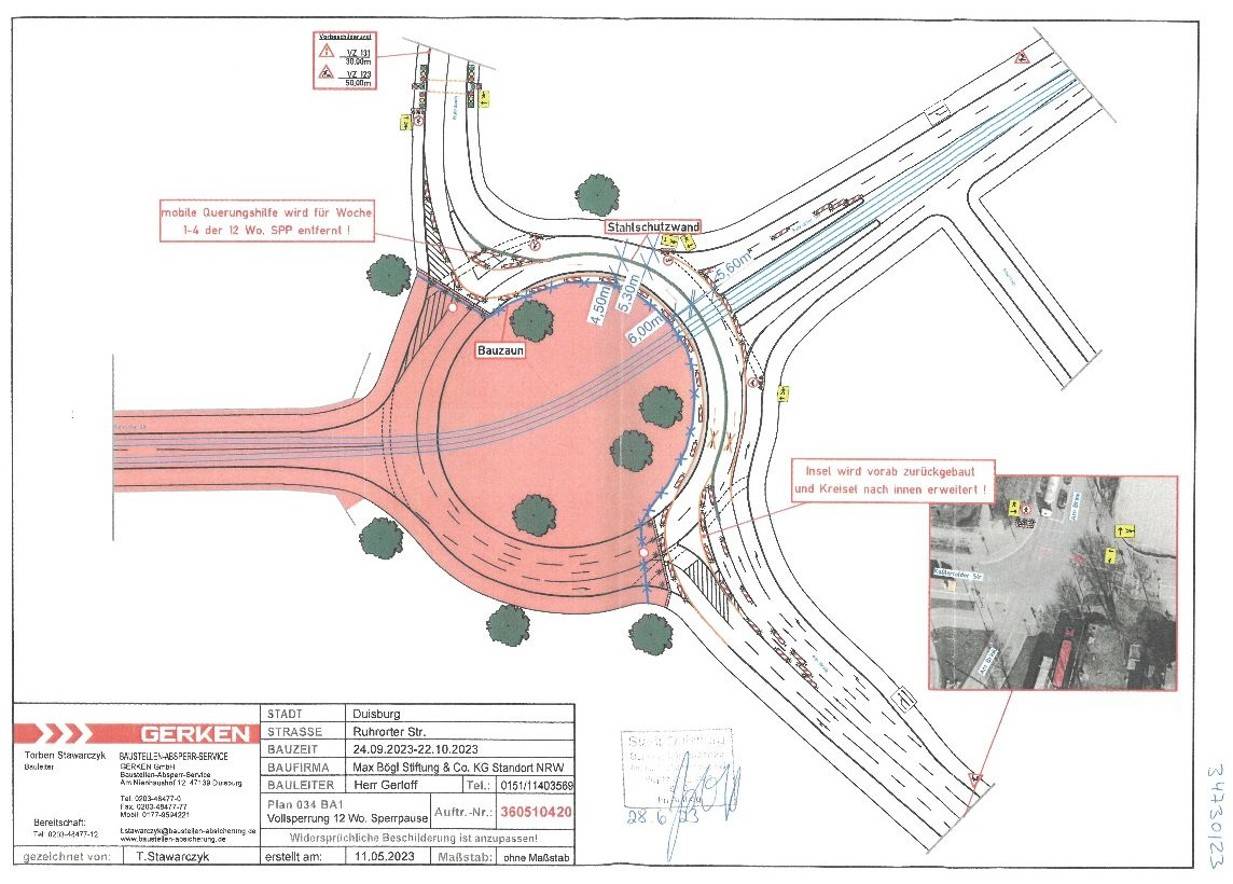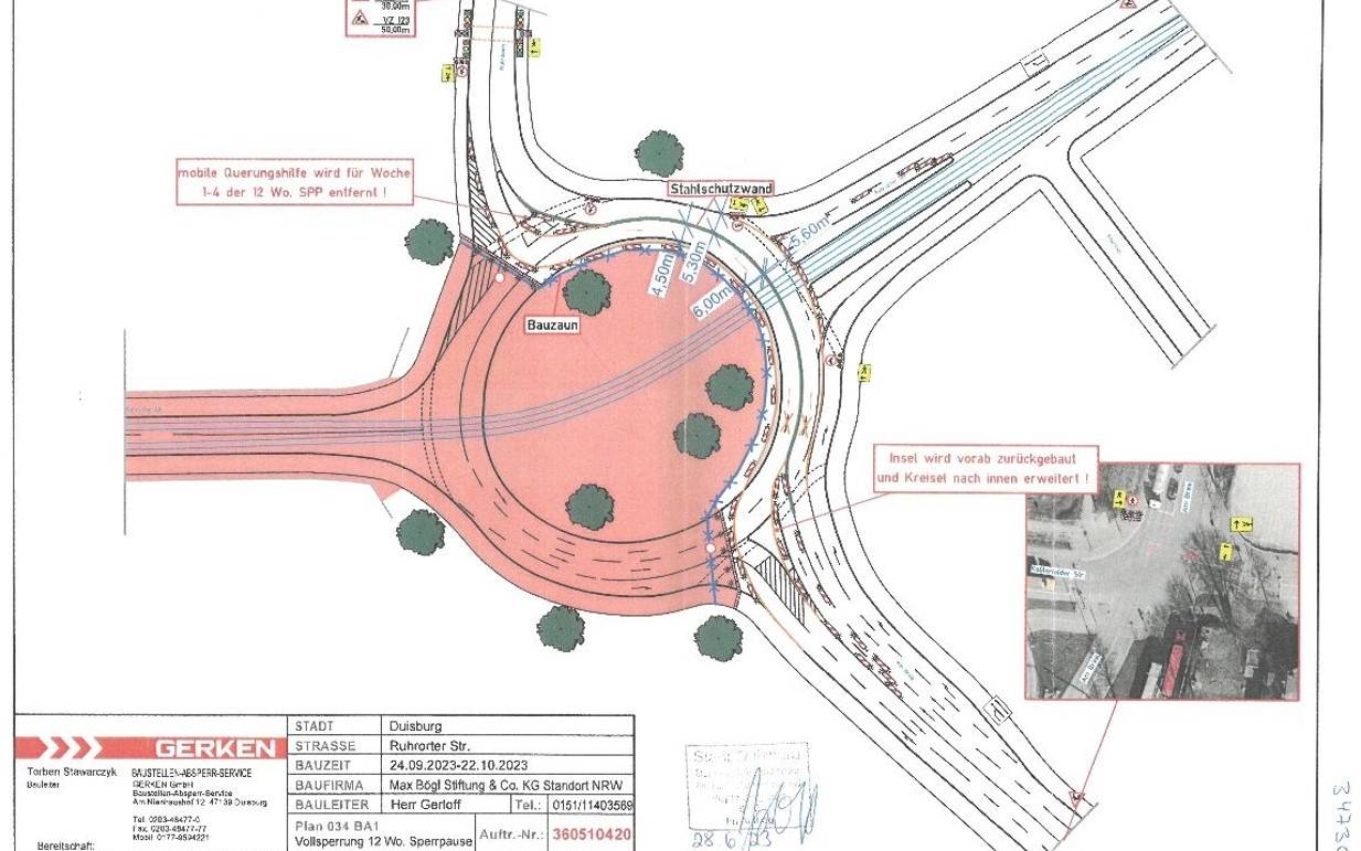 Für den Anschluss der neuen Brücke muss der Kreisel halbseitig gesperrt werden. Das bedeutet, dass man aus Fahrtrichtung Ruhrdeich kommend, im Kreisverkehres nur geradeaus in Richtung Zubringer/A40 fahren kann. Ein Abbiegen Richtung Innenstadt/Kaßlerfeld ist nicht möglich. Eine Umleitung wird über die Max-Peters-Straße ausgeschildert.