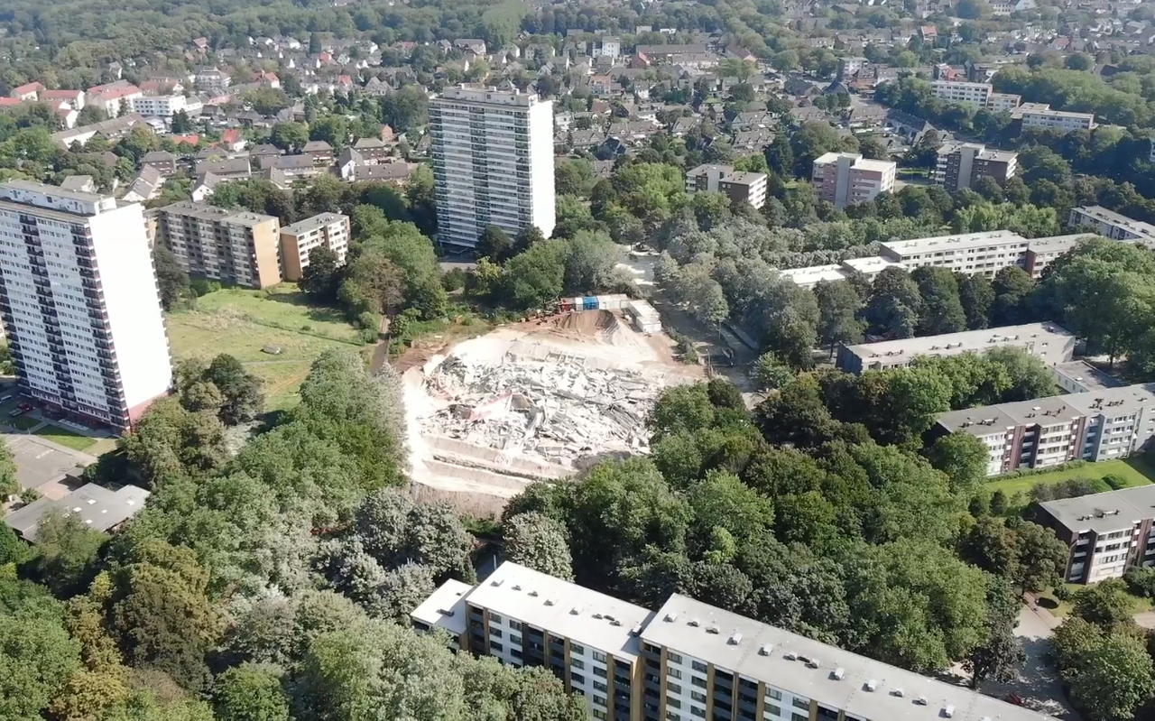 Erfolgreiche Sprengung in Hochheide: Mit 10 Minuten Verspätung ist gestern (5.9.) der zweite weiße Riese in 50.000 Tonnen Schutt verwandelt worden.