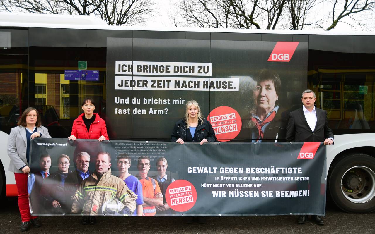 "Vergiss nie, hier arbeitet ein Mensch!" - so lautet der Slogan der neuen Kampagne des Deutschen Gewerkschaftsbundes. Diese wurde heute auf dem Betriebsgelände der DVG vorgestellt. Zum Beispiel mit Hilfe von Plakaten in den Fahrzeugen wollen DVG und DGB auf die Situation der Beschäftigen aufmerksam machen. In einer Umfrage haben 67% angegeben schonmal Opfer von Übergriffen geworden zu sein. So werden Fahrer oder Kontrolleure beispielsweise immer öfter bedroht, bespuckt oder sogar verletzt. Mit der Kampagne sollen solche Vorfälle sichtbar gemacht und das öffentliche Bewusstsein geschärft werden.