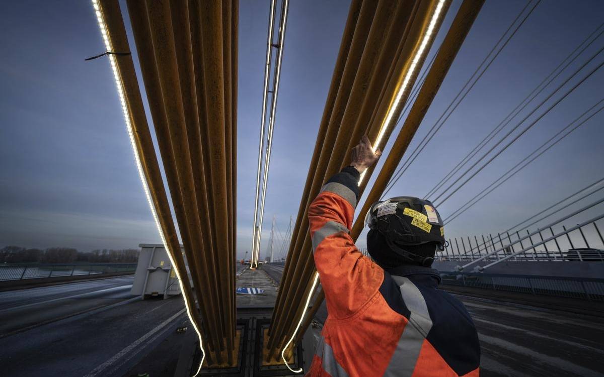 Die alte A40-Rheinbrücke darf ab jetzt nur noch zeitlich begrenzt beleuchtet werden. Eine für den Abriss der Brücke beauftragte Firma aus den Niederlanden hatte die Weihnachtsbeleuchtung installiert.