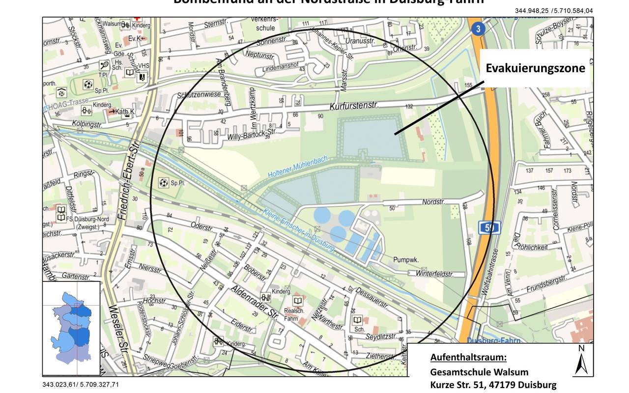 In Aldenrade ist eine Bombe aus dem zweiten Weltkrieg entdeckt worden. Der Fundort der amerikanischen Zehn-Zentner-Bombe liegt auf der Nordstraße in Höhe der Kläranlage. Die Bombe soll heute um 19 Uhr gesprengt werden. Aus diesem Grund wird eine Evakuierungszone von 600 Metern rund um den Fundort eingerichtet. Diese darf ab heute um 18 Uhr nicht mehr betreten werden. Wegen der Sperrungen kann es vor Ort zu Verkehrsbehinderungen kommen, die A59 soll laut der Stadt aber nicht betroffen sein. Etwa 4400 Menschen müssen zeitweise ihre Häuser verlassen. Eine Aufenthaltsraum für die Zeit der Evakuierung ist in der Gesamtschule Walsum eingerichtet.