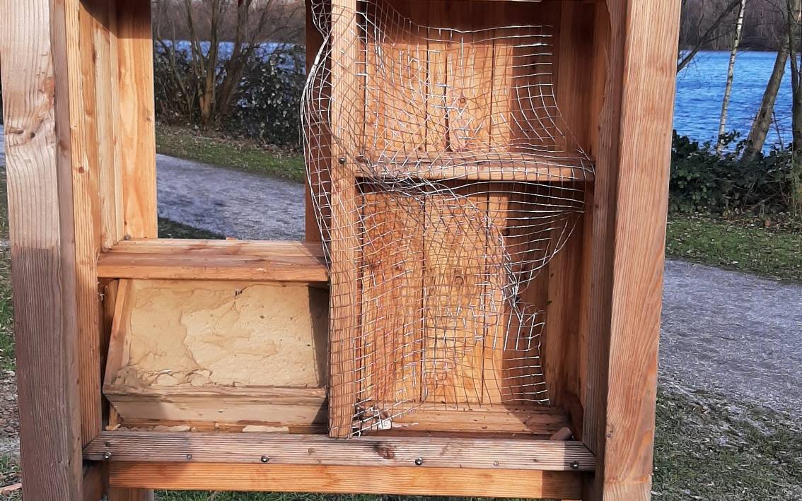 Unbekannte haben am vergangenen Wochenende ein Wildbienenhaus, einige Obstbaumpfähle und eine 240 Liter Mülltonne am Uettelsheimer See in Homberg zerstört.